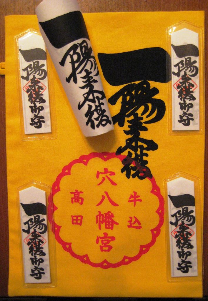 「一陽来福」のお札の面々です。今年は奮発して「福財布(黄色の袋)」も買ってしまいました。穴八幡の禰宜(ねぎ)さんが“福財布の中に通帳を入れておきますとお金がたまりますよ”といわれました、来年は金満家に変身です(高笑)