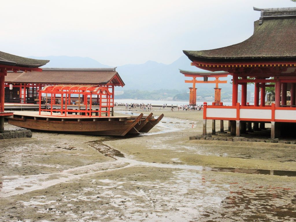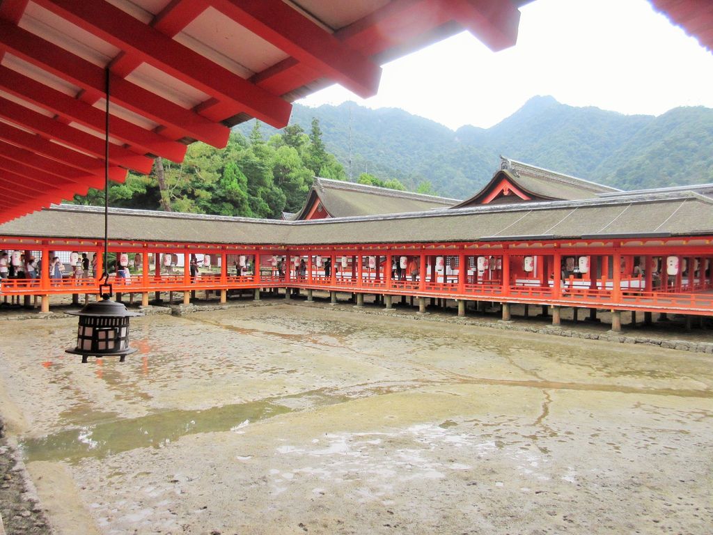 海上に建ち並ぶ美しい建造物群は、平安時代の住宅建築様式・寝殿造りを取り入れたもので、背後の弥山の緑や瀬戸の海の青とのコントラストはまるで竜宮城を思わせる美しさです。